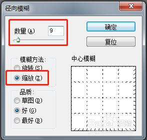 此刻回到副本图层,选择滤镜→恍惚→径标的目的恍惚,“数目”设置一个合适的值,这里写的是9,恍惚方式选择缩放。