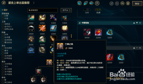 兰顿之兆,这件装备可以供给很是不错的生命值和护甲加当作,关头是可以降低敌方英雄的暴击,本家儿动利用还可以减速敌方,在团战的时辰,若是对面站一路,可以闪现E,然后蓝盾开启,然后Q打出爆炸危险。若是比力喜好单带的话可以换当作亡者的板甲。