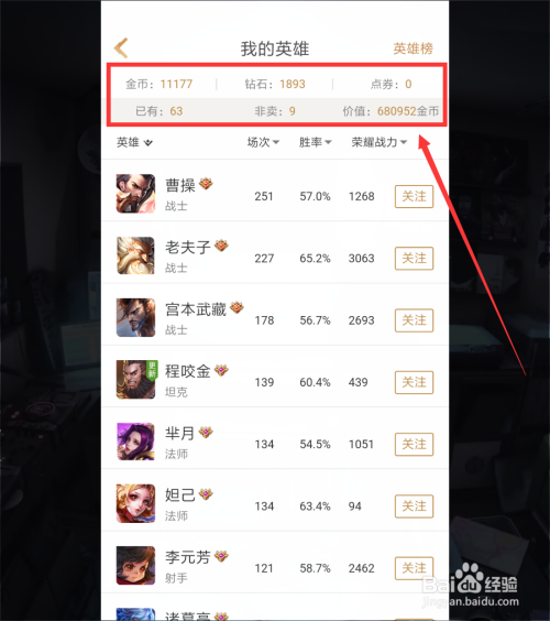 我们来到本身这个王者荣耀账号拥有的英雄页面之后,我们在这里可以查看到这个账号中拥有几多英雄,这些英雄价值几多金币,进场次数,胜率等等信息 。