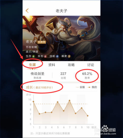 我们首先来到的是这个英雄利用生活生计页面,在这个页面我们可以查看到这个英雄的总进场数、总胜率、比来十场的评分等等信息 。
