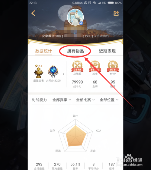 接着,我们在王者荣耀小我资料页面找到“拥有物品 ”按钮,点击进入我们王者荣耀这个账号拥有的物品页面 。