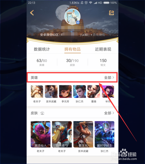 然后,我们在小我账号拥有物品页面找到“全数英雄 ”按钮,点击进入到本身拥有的所有英雄页面 。
