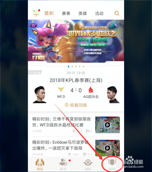 首先,我们在王者荣耀首页面找到“战绩 ”按钮,点击进入王者荣耀助手新战绩页面 。