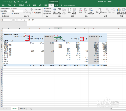在右下角操作区域将“年”“季度”“日期”,拖动到列区域,将“类别”拖动到行区域,值设置为“乞降项:金额”,此时再看表中的数据区域,则可以看到一个对费用台账进行数据汇总的数据透视表就生当作了