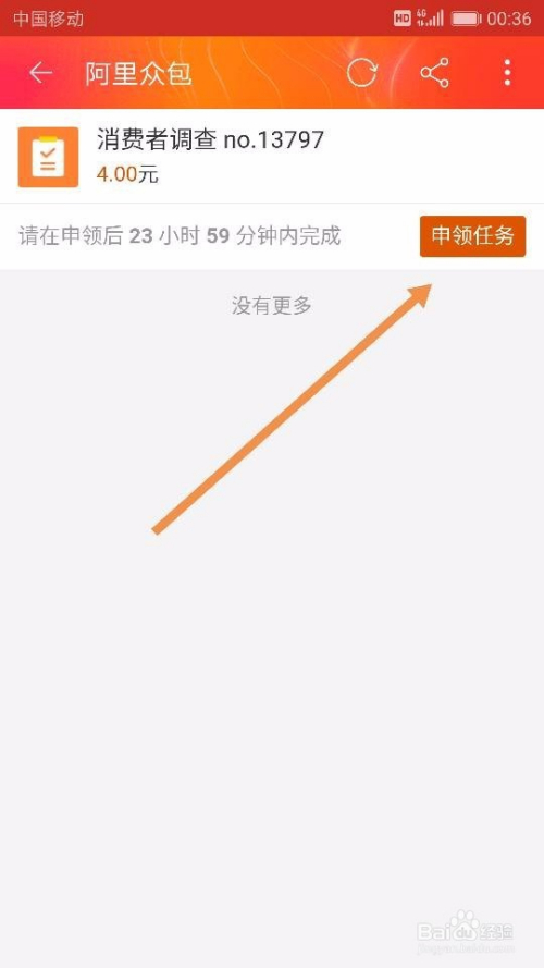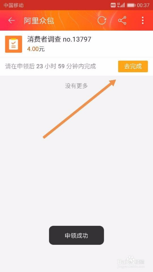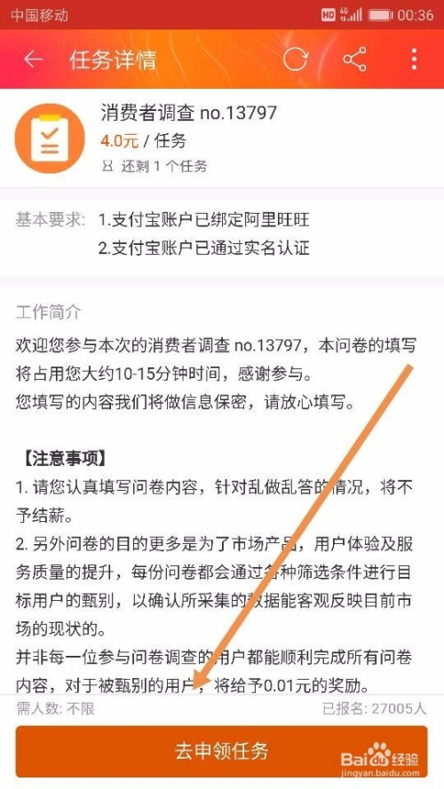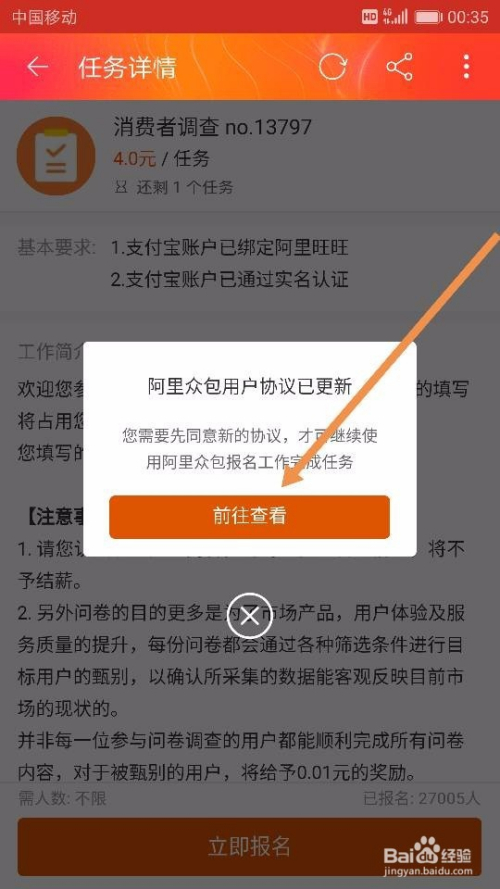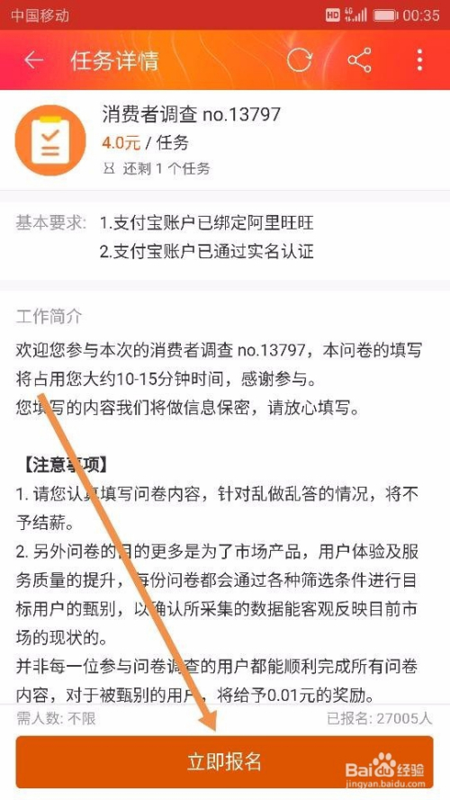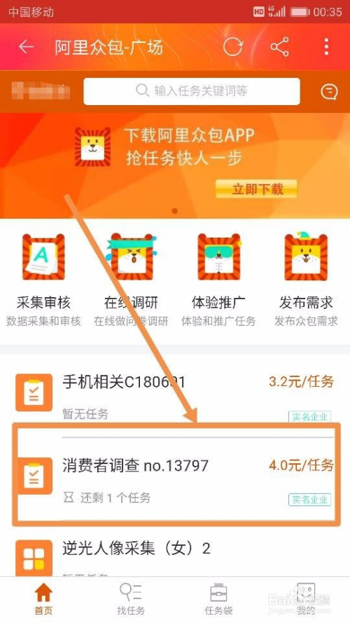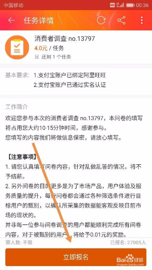 点击【当即赚钱】后,我们就来到了【阿里众包-广场】,可以在这里面选择本身想要做的和适合本身做的有关手机兼职了。好比,我们直接点击界面中的【消费者调查】使命,点击后我们选择【当即报名】,如图所示~