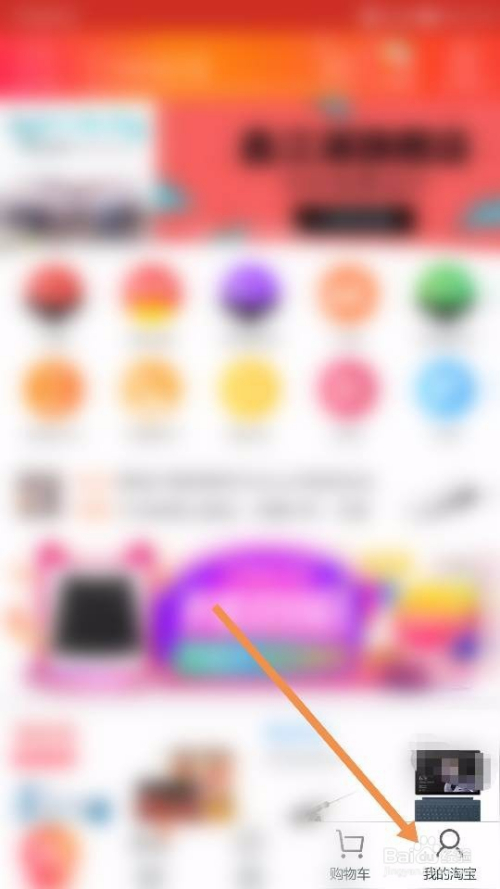 打开手机上的淘宝软件,进入其首界面后,我们直接点击底部右下角的【我的淘宝】选项,如图所示。筹办去往淘宝的小我相关的一些设置界面~