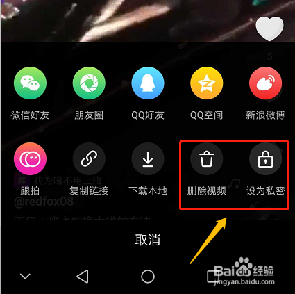 点击此图标今后,会在此页面下方弹出一个窗口,此中有一项"删除视频",点击此项就可以对本身发布出的视频进行删除处置了,也可以直接设置为私密同样也是可以的;