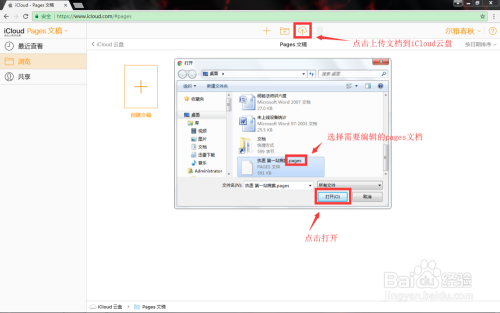 如图,进入pages文稿,点击iCloud云盘图标,将需要编纂或转换的pages文档上传至云盘。