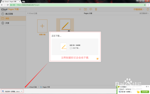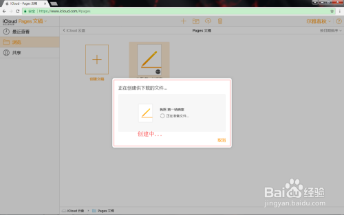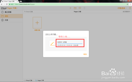 登录当作功后,如图,可以选择先将pages文档上传至iCloud云盘,也可以直接点击“pages文稿”图标,小编以直接点击pages文稿为例
