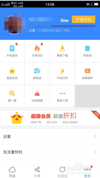 回到网盘本家儿页,点击右下角的更多图标,可以看到网盘的容量等内容,还可以点击左下角的设置按钮对网盘进行设置。