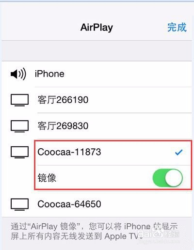 在“AirPlay”选项的界面中,找到你要毗连的智能电视的ID,而且打开设备的”镜像“开关