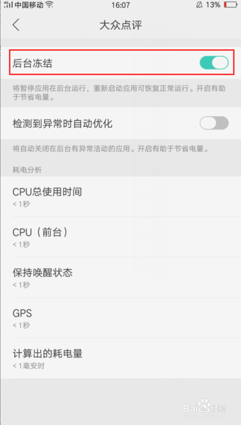 若是解除以上设置后,呼吸灯仍是没亮起,在设置--电池--耗电详情--第三方软件--后台冻结(ColorOS 3.0路径),查看应用是否被后台冻结,封闭响应的开关再看看。