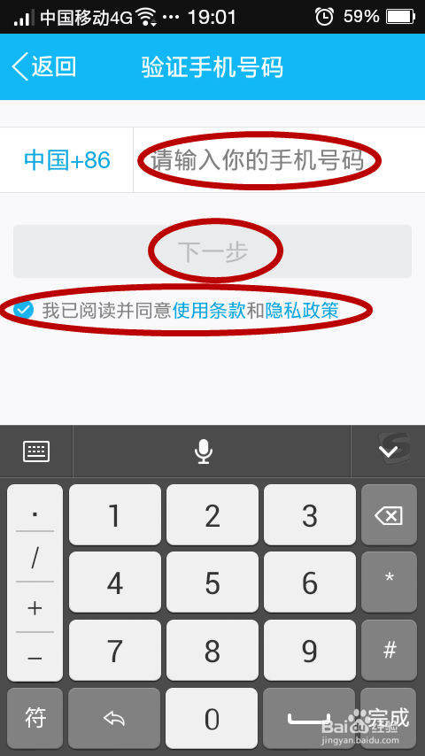 进入注册页面后,在“请输入你的手机号码”处输入手机号码,确保“我已阅读并赞成利用条条目和隐私政策”前有对勾。点击下一步。