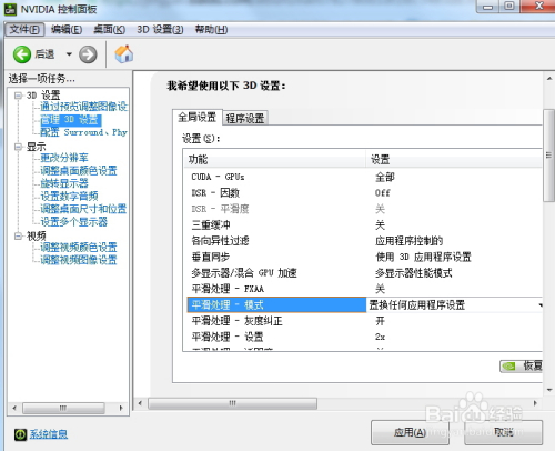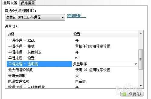 “光滑处置-模式”,该选项是选择是否要在驱动中强行节制游戏反锯齿的。