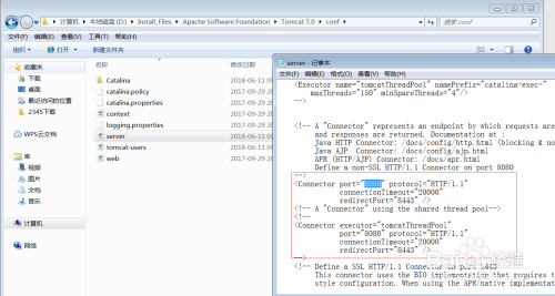 4、确定端标语:打开Tomcat设置装备摆设文件地点路径,打开server.xml文件,查看端标语。