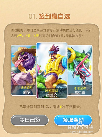 在这个活动中我们可以看到,第一弄法是签到领取7天皮肤,总共有三条目皮肤。按照签到的时候来领取,别离是签到2天,5天,8天。