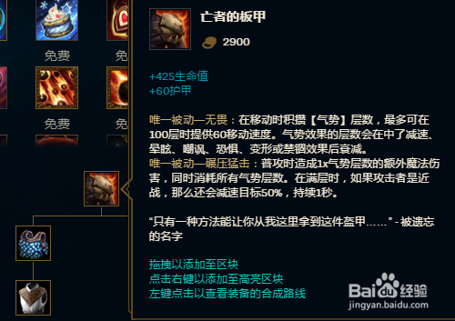 接下来若是团的比力早,可以先补一个板甲来提高生命值和护抗,有利于团战中的保存。当然我小我喜好板甲的原因本家儿要仍是它跑图的速度挺快的。