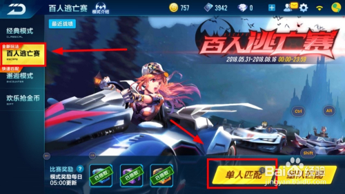 选择“百人逃亡赛”选项,点击“单人匹配”模式,完当作一局百人逃亡赛即可