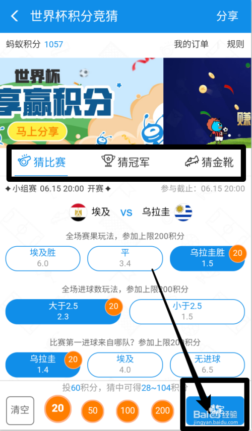 点击选择竞猜的宿世界杯球队,付出蚂蚁积分进行竞猜,点击【确认】