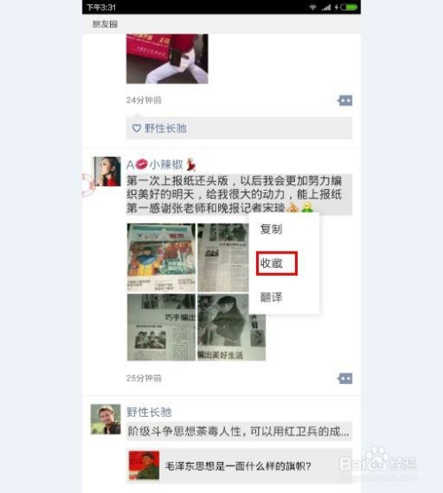 打开微信,进入朋友圈或者聊天页面,将手指轻压在文字或者视频、图片上,点“保藏”即可