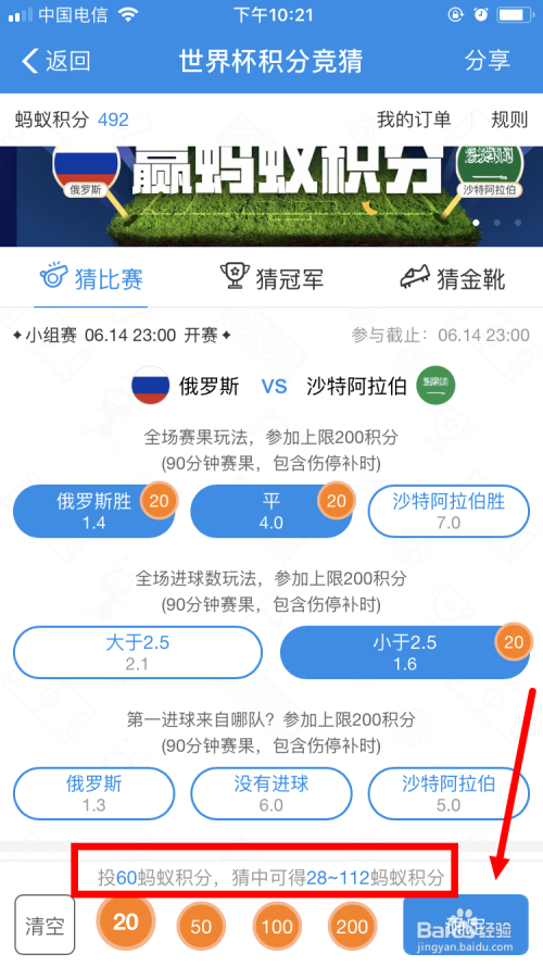 在接下来的页面中,左上角可以看到本身的蚂蚁积分。该活动有三个年夜项,别离是猜角逐、猜冠军和彩金靴。小编以才角逐为例,为大师讲解玩儿法。在才角逐项面前目今面,每场角逐有三种玩儿法。好比输赢平、大小球、首先进球的步队。注码有20、50、100和200(当然都是积分)四种,注码上限是200积分(也就是说每场角逐的每种玩儿法最多投注200积分)。