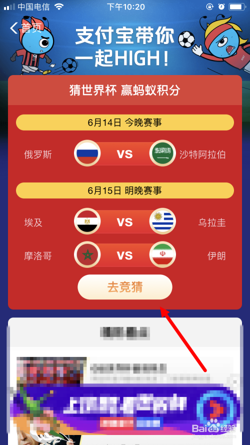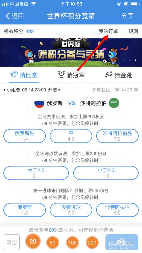 宿世界杯起头了,付出宝推出了 积分猜球 的活动,也就是用蚂蚁积分下注竞猜宿世界杯球赛成果。下面我们来看看如何玩儿?