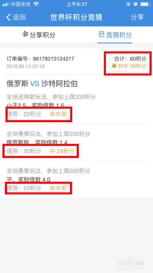 当角逐竣事后,依然是进入 我的订单—竞猜积分 的页面,便可以看到竞猜的成果。好吧,小编是输了。投注了60积分,只拿回28积分。