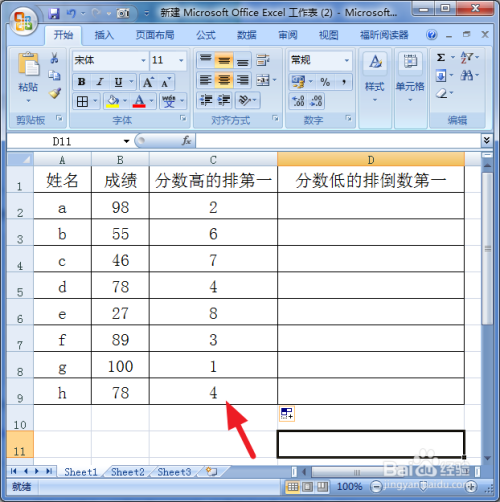 第二单位格呈现排名第七,然后像拉填没收式,出来从分数从低到高的摆列名次