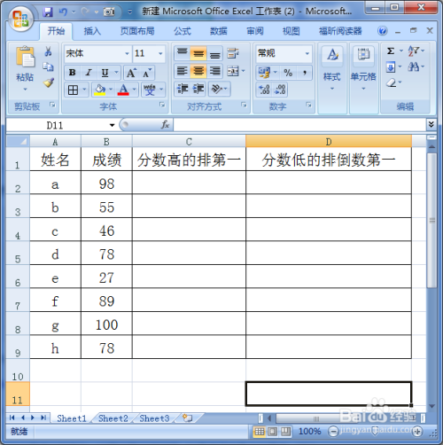 新建一个excel文件,从中可以看到两列数据,姓名和成就,我们此刻要别离按分数从高到低排名,从低到高排名