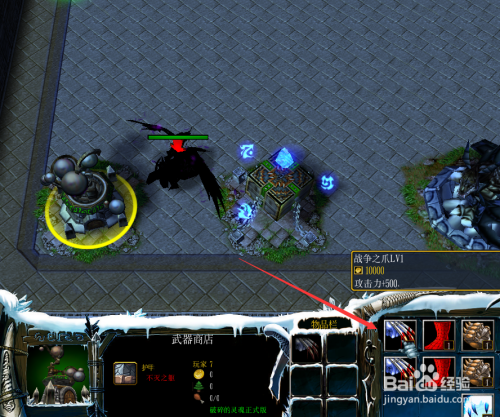 英雄出生时系统送了10000金币,如许可以到游戏左下角的兵器商铺采办个兵器,如下图所示。