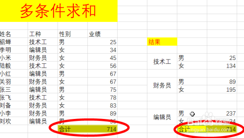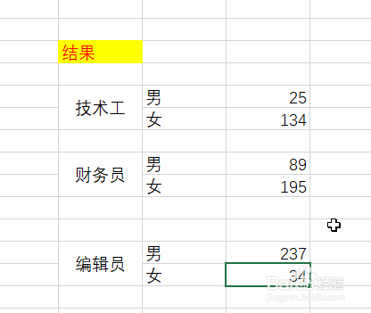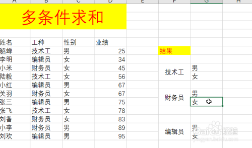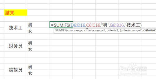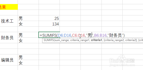 在“财政员-男”单位格中输入:=SUMIFS(D6:D16,C6:C16,"男",B6:B16,"财政员")