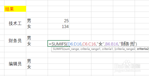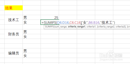 在“财政员-女”单位格中输入:=SUMIFS(D6:D16,C6:C16,"女",B6:B16,"财政员")