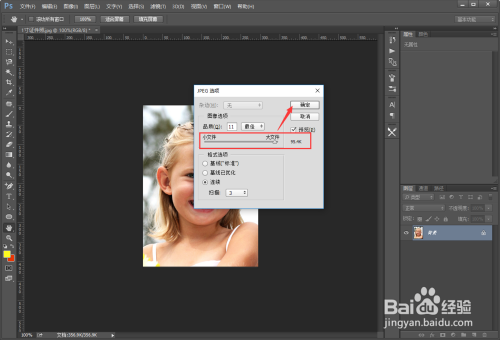 在JPEG选项中可以调整文件的大小,鼠标往左拖动【小三角】,在右侧可以看到估计保留图片的大小,我们调整它到100K以内,点击【确定】。