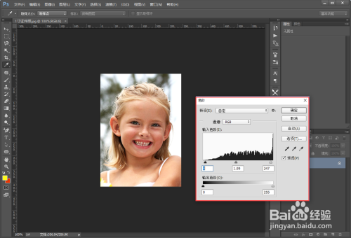 我们用PS打开证件照,可以用色阶略微调整下照片的亮度、对比度。