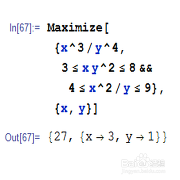 发现,当取得最小值的时辰,无法给出x和y的切确值,只能给出近似值。同时,也能发现(x^3)/(y^4)的取值规模是[2,27]。