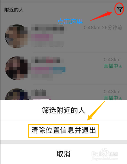 当然若是我们开启了四周的人功能,那么也会偶然收到其他人发来的信息,想要封闭四周的人就要在适才页面的右上角点击一个漏斗的图标,然后鄙人方弹出的窗口点击"断根位置并退出"即可;