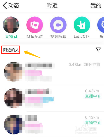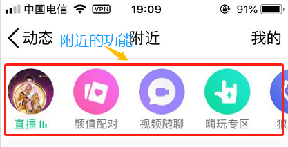 点击此项今后,在四周页面的下方是四周的一些功能,好比我们可以看四周的人直播、和四周的人视频聊天等,下图是四周的一些功能;