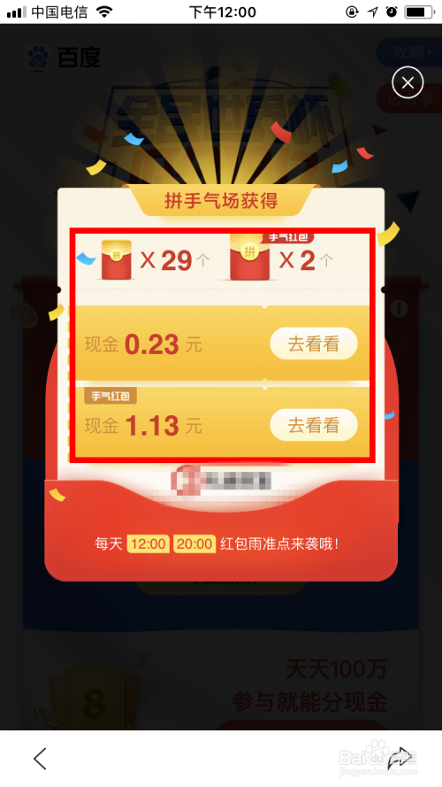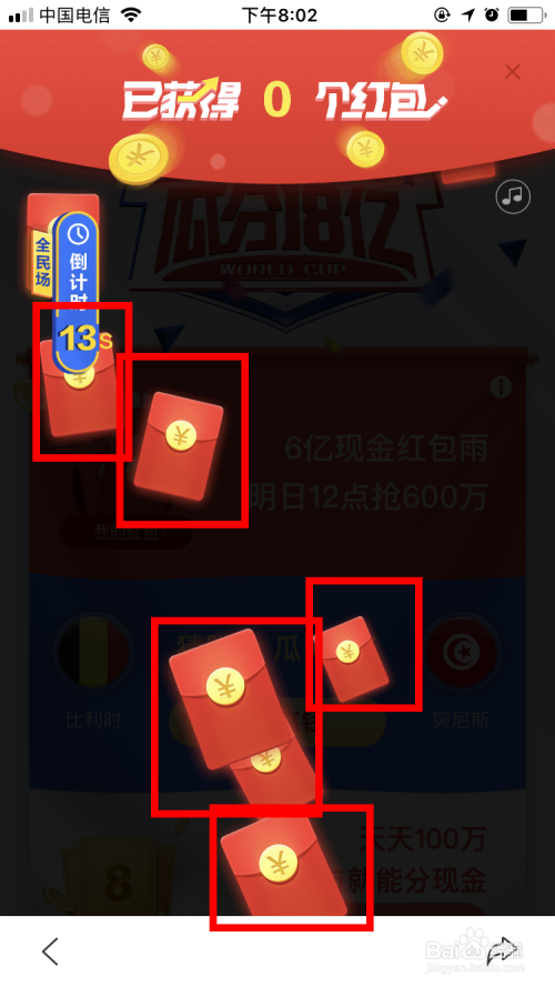 进入活动页面后,屏幕上会下起红包雨,我们需要做的是竟可能多的点击这些红包。时候大要持续十几秒。
