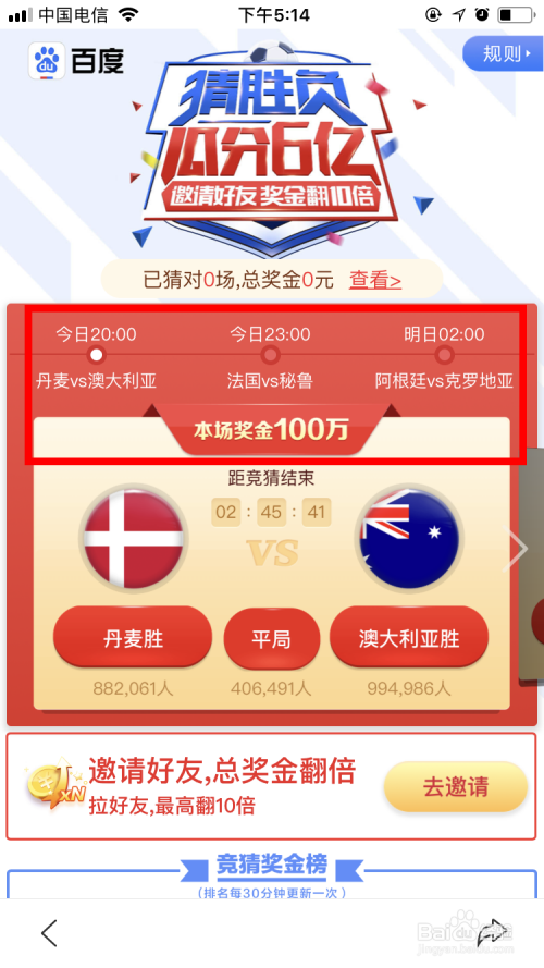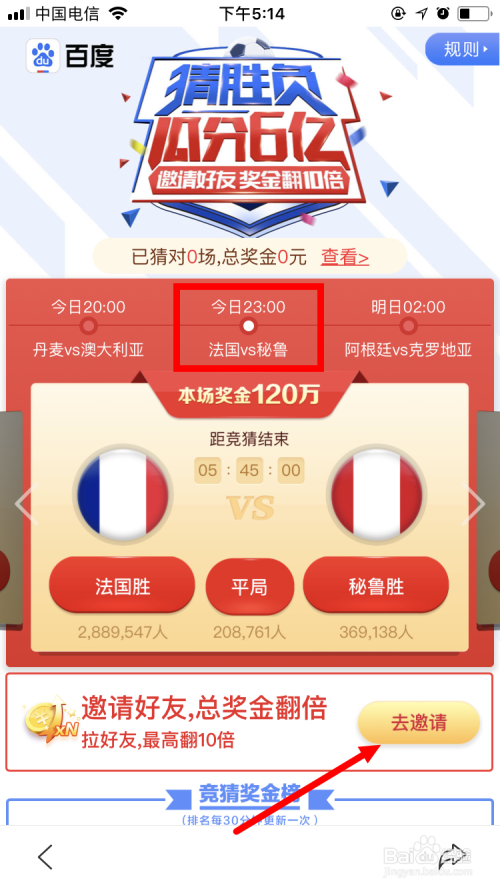 滑脱手指可猜下一场。别的,点击下面的 去邀请 ,将活动分享给老友。当老友加入活动后,就可以使我们的奖金翻倍,最高可翻到10倍。