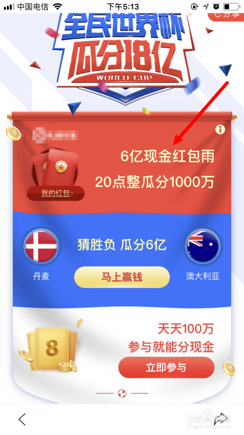 进入活动页面后,会看到有三个项目: 红包雨 、 猜输赢 以及 天天100万 。