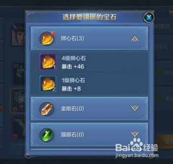 护甲的第一个宝石槽能镶嵌狮心石(暴击)、金刚石(韧性)、猫眼石(闪避)、尖晶石(射中)四种,前期在资金有限的环境下,小臣建议本家儿君在商城利用金币购买一些1级狮心石或猫眼石,按照英雄特征进行镶嵌,增添危险或保存能力。
