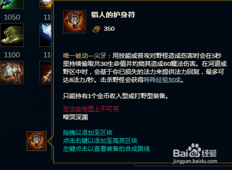 霞打野出门装可以带猎人的护人符+复用型药水,这个可以提高霞对野怪的危险,还有回蓝的结果。