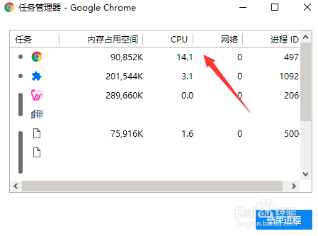 进入使命办理器进口后,可以看到下图所示的页面,可以看到你各个网页占用的cpu等等数据。