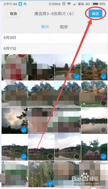 然后在打开的页面中按照需要选择3-6张照片,选好之后,点击右上角的 确定 按钮。