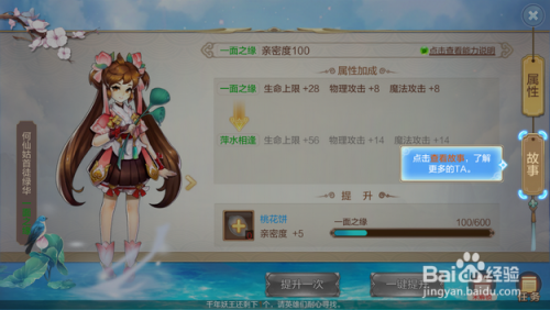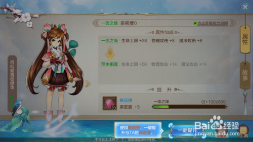 第二步,利用【桃花饼】一键晋升与【绿化仙子】的亲密度。一块【桃花饼】可以晋升5点亲密度,需要达到600亲密度才能由此刻的【一面之缘】晋升到下个品级【不期而遇】,我们按照提醒,点击【一键晋升】,进行亲密度晋升。