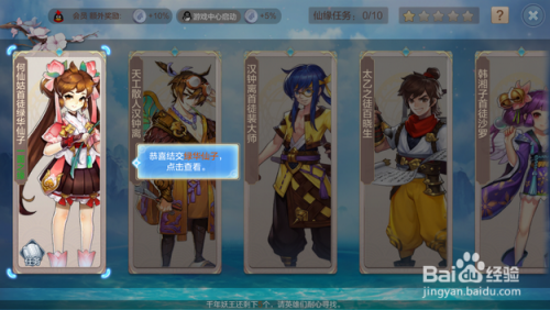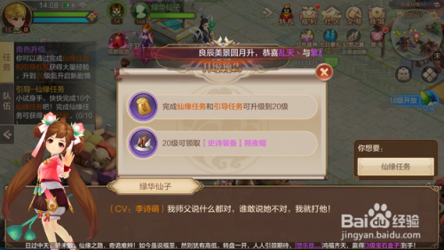 第一步,当然是将游戏脚色进级到15级,当晋升到15级的时辰,会主动跳出【仙缘使命】如下图,第一个仙缘人物是【何仙姑的首徒绿华仙子】,按照提醒,点击【绿华仙子】的人物图片进行交友。