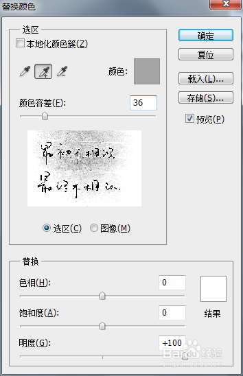 执行“图像→调整→替代颜色”,设定一个合适的颜色容差值,这里设定的是36,共同“添加到取样”东西拔取图片中灰色部门,将灰色替代为白色。