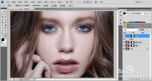 为图层1添加图层蒙版,并选择黑色画笔东西,将头发和眼睛用黑色画笔在蒙版上涂抹。