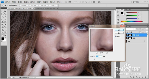新建空白图层2,选择修复画笔东西, 上方属性:样本选择:所有图层。在痘痘 上涂抹。简单修复年夜的点。