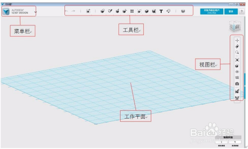 123DDesign界面由菜单栏、东西栏、视图栏和工作平面四个部门构成。